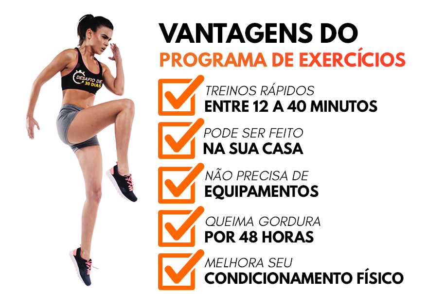 Para acelerar o seu metabolismo, queimar mais calorias, e perder peso mais rápido, você pode praticar os exercícios do desafio de 30 dias. Os exercícios do desafio de 30 dias, são exercícios aeróbios, de média e alta intensidade, e o melhor é que você não precisa de aparelhos e pode ser praticado em qualquer lugar que você quiser.